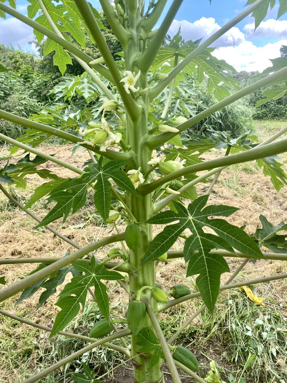 2022年8月6日レポート 2022.08.06 よかど市青パパイヤ農園 Tweet Share Hatena Pocket RSS feedly Pin it 暑い日が続いていますが、さすが南国育ちの青パパイヤたち!元気に育っています。花が咲いてから3週間~1か月ほどたちましたが、見て下さい!花の終わったところから、実がなりだして、少しずつ大きくなっていますよ♪